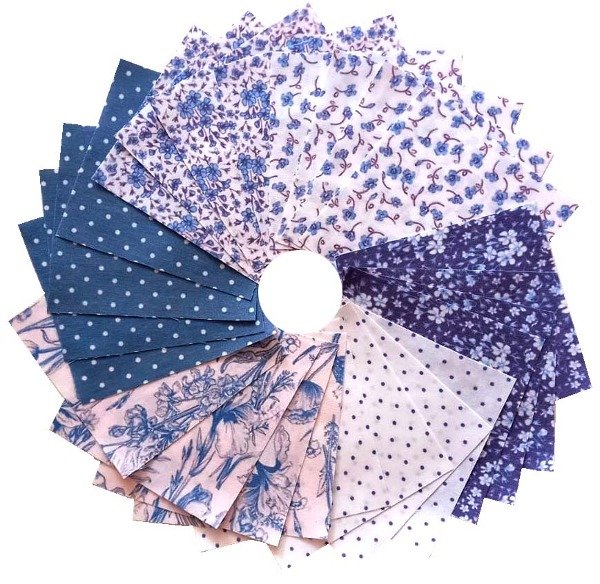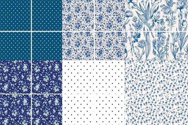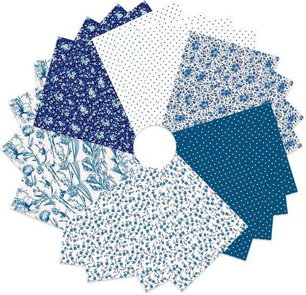 24 Retazos de tela de diseño temática tonos serie Tonos azules x24u de 10cm x10cm, CON ENTRETELA FUSIONADA, la misma ya viene fusionada a la telas, listas para usar, ideal para proyectos que requieren tela con más cuerpo y a la vez flexibilidad.